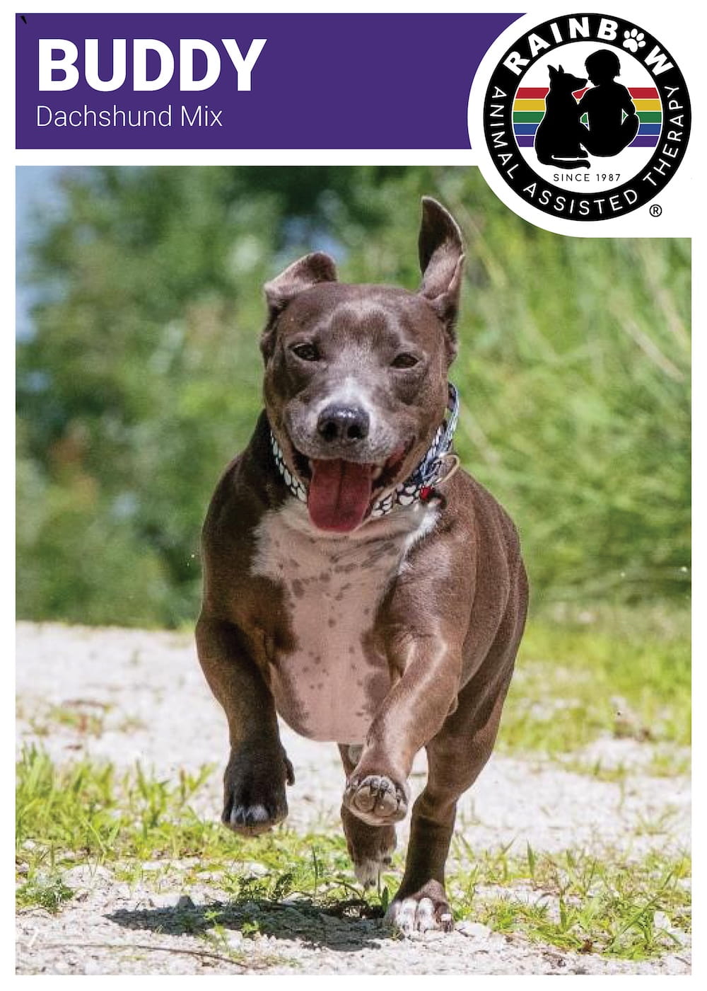 Meet Buddy Certified Rainbow Animal Assisted Therapy Dog since 2023 Buddy SPONSORED BY PET SUPPLIES PLUS Community Advocate Sponsor since December 2024 Join Sponsorship Back to List Name: BuddyBreed: Dachshund MixBirthdate: March 21, 2020Date Certified: June 29, 2023 Favorite Toy: Squeaky stuffed animalsFavorite Activity: Long walks and agility Become a Volunteer APPLY NOW Sponsor a Rainbow Dog MEET OUR DOGS Request a Program GET STARTED Make a Difference DONATE NOW