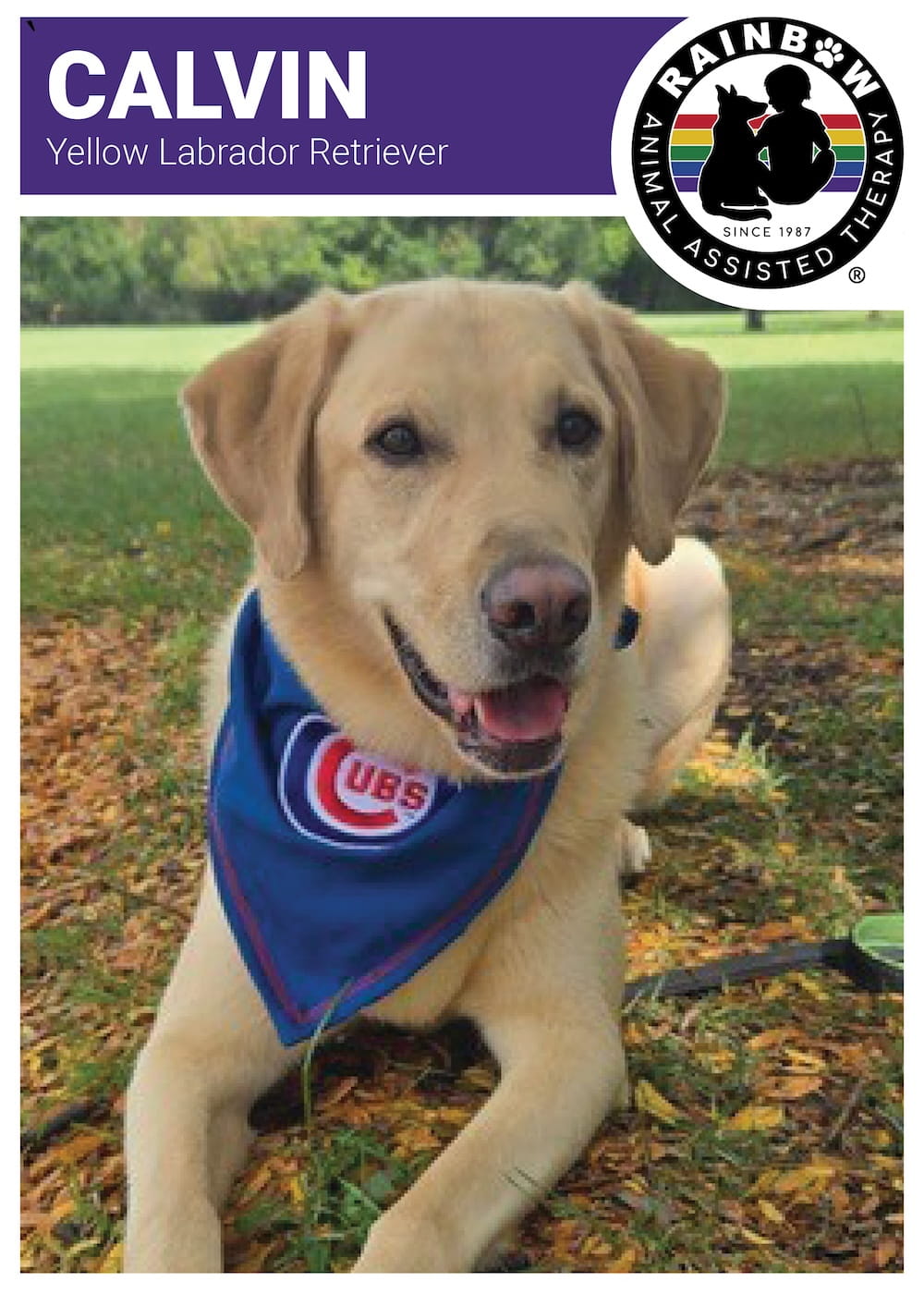 Meet Calvin Certified Rainbow Animal Assisted Therapy Dog since 2023 Calvin AVAILABLE FOR SPONSORSHIP Sponsor Now Back to List Name: CalvinBreed: Yellow Labrador RetrieverBirthdate: May 18, 2020Date Certified: August 31, 2023 Favorite Toy: Tennis balls and NylabonesFavorite Activity: Therapy work, agility, and nose work Become a Volunteer APPLY NOW Sponsor a Rainbow Dog MEET OUR DOGS Request a Program GET STARTED Make a Difference DONATE NOW