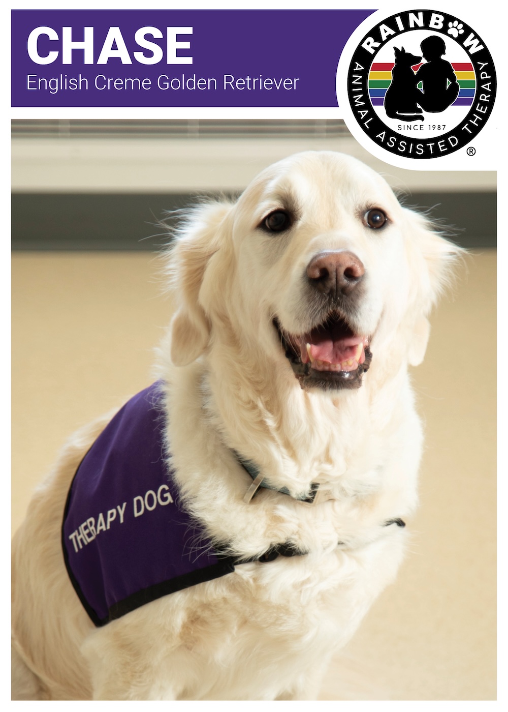 Meet Chase Certified Rainbow Animal Assisted Therapy Dog since 2023 Chase EXCLUSIVELY SPONSORED BYSTRONG LIKE SEANIn loving memory of Sean Witsoe Impact Partner Sponsor since July 2024 Unavailable Back to List Name: ChaseBreed: English Creme Golden RetrieverBirthdate: July 25, 2015Date Certified: July 15, 2023 Favorite Toy: Random socksFavorite Activity: Long walks, being loved on by people, and doing activities for treats Become a Volunteer APPLY NOW Sponsor a Rainbow Dog MEET OUR DOGS Request a Program GET STARTED Make a Difference DONATE NOW