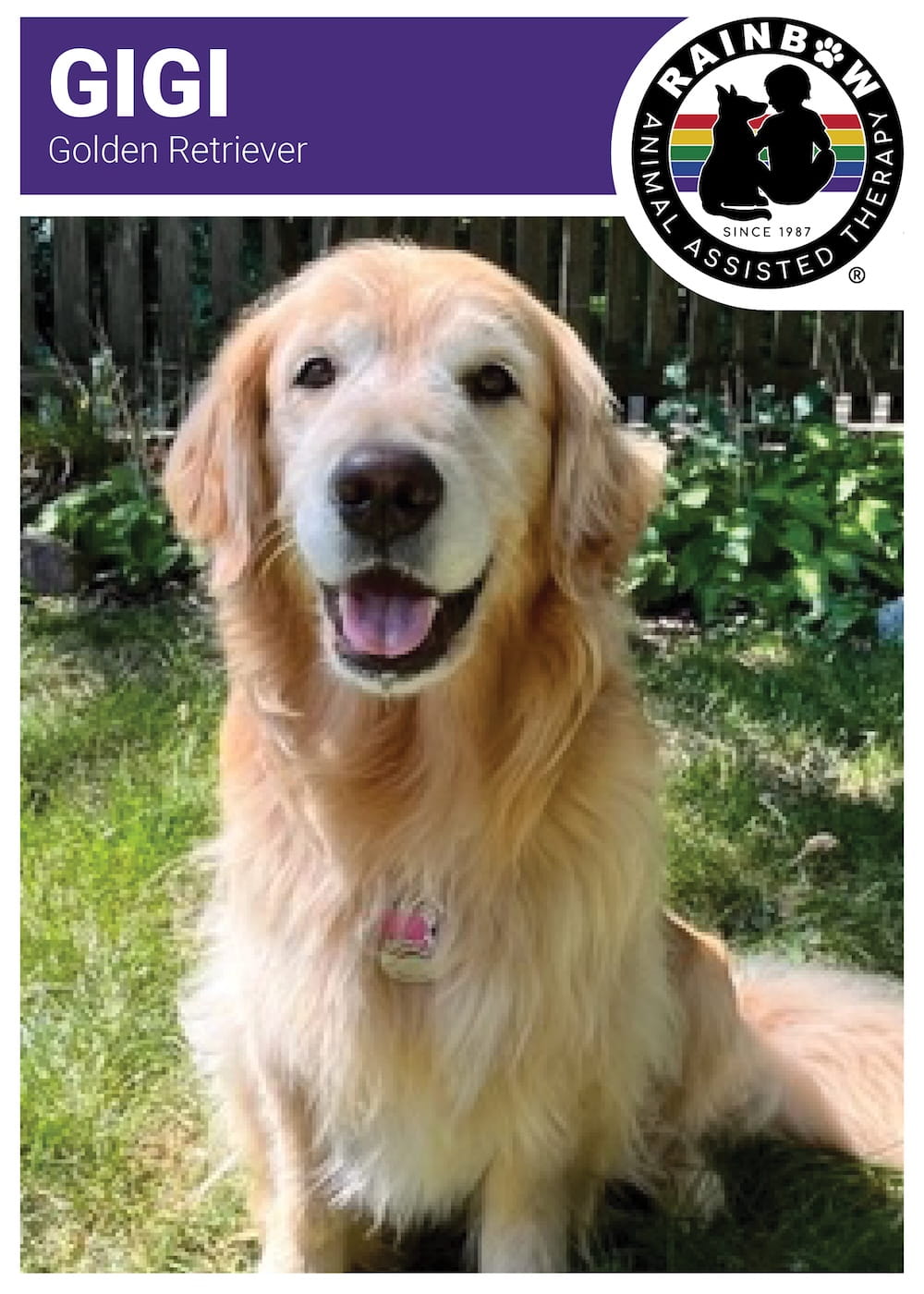 Meet Gigi Certified Rainbow Animal Assisted Therapy Dog since 2019 Gigi AVAILABLE FOR SPONSORSHIP Sponsor Now Back to List Name: GigiBreed: Golden RetrieverBirthdate: April 11, 2017Date Certified: April 5, 2019 Favorite Toy: A tennis ballFavorite Activity: Other than being a therapy dog, competing in nose work trials Become a Volunteer APPLY NOW Sponsor a Rainbow Dog MEET OUR DOGS Request a Program GET STARTED Make a Difference DONATE NOW