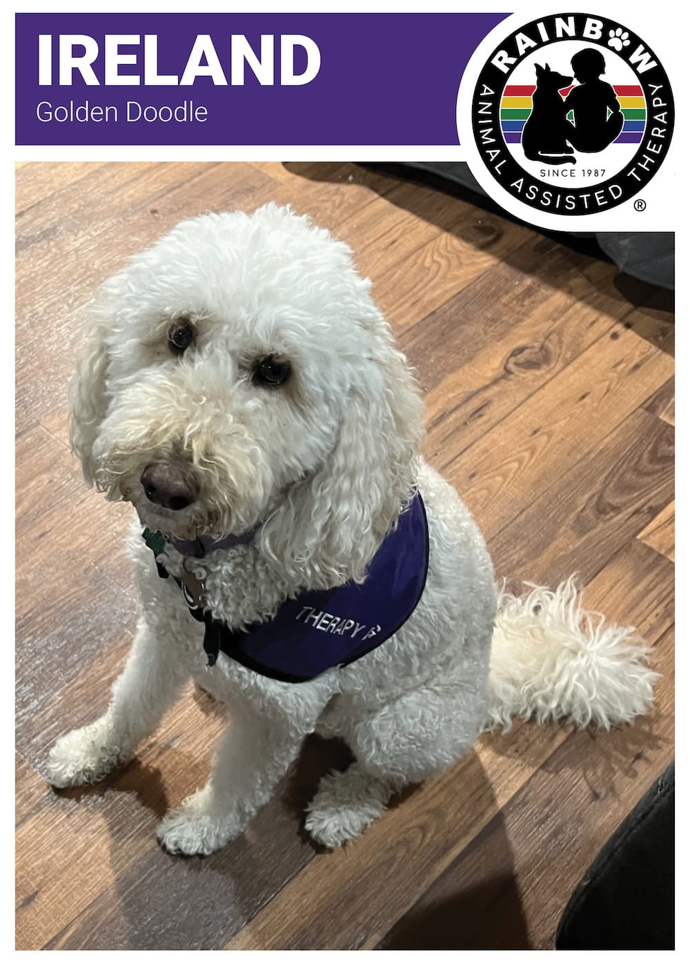 Meet Ireland Certified Rainbow Animal Assisted Therapy Dog since 2020 Ireland EXCLUSIVELY SPONSORED BYMCGRATH LEXUS OF CHICAGO Impact Partner Sponsor since February 2026 Unavailable Back to List Name: IrelandBreed: Golden DoodleBirthdate: June 15, 2019Date Certified: January 1, 2020 Favorite Toy: Tennis ballFavorite Activity: Chasing rabbits & squirrels Become a Volunteer APPLY NOW Sponsor a Rainbow Dog MEET OUR DOGS Request a Program GET STARTED Make a Difference DONATE NOW