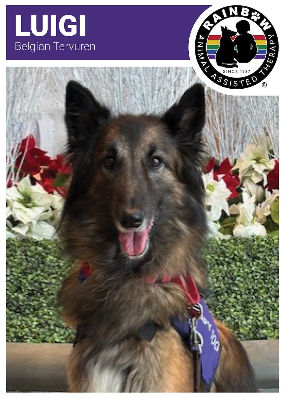 Meet Luigi Certified Rainbow Animal Assisted Therapy Dog since 2019 Luigi SPONSORED BY GLENBROOK HOSPITAL Community Advocate Sponsor since January 2025 Join Sponsorship Back to List Name: LuigiBreed: Belgian TervurenBirthdate: January 30, 2017Date Certified: December 6, 2019 Favorite Toy: A hollow ballFavorite Activity: Rainbow programs, tug-of-war with brother, Geppetto, playing with button buzzers, and agility Become a Volunteer APPLY NOW Sponsor a Rainbow Dog MEET OUR DOGS Request a Program GET STARTED Make a Difference DONATE NOW