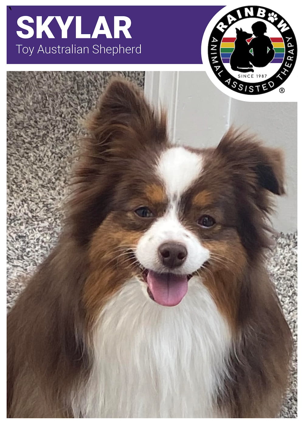 Meet Skylar Certified Rainbow Animal Assisted Therapy Dog since 2023 Skylar AVAILABLE FOR SPONSORSHIP Sponsor Now Back to List Name: SkylarBreed: Toy Australian ShepherdBirthdate: April 23, 2021Date Certified: April 9, 2023 Favorite Toy: A stuffed animal named Hairy GarciaFavorite Activity: Running and chasing a ball in the park Become a Volunteer APPLY NOW Sponsor a Rainbow Dog MEET OUR DOGS Request a Program GET STARTED Make a Difference DONATE NOW