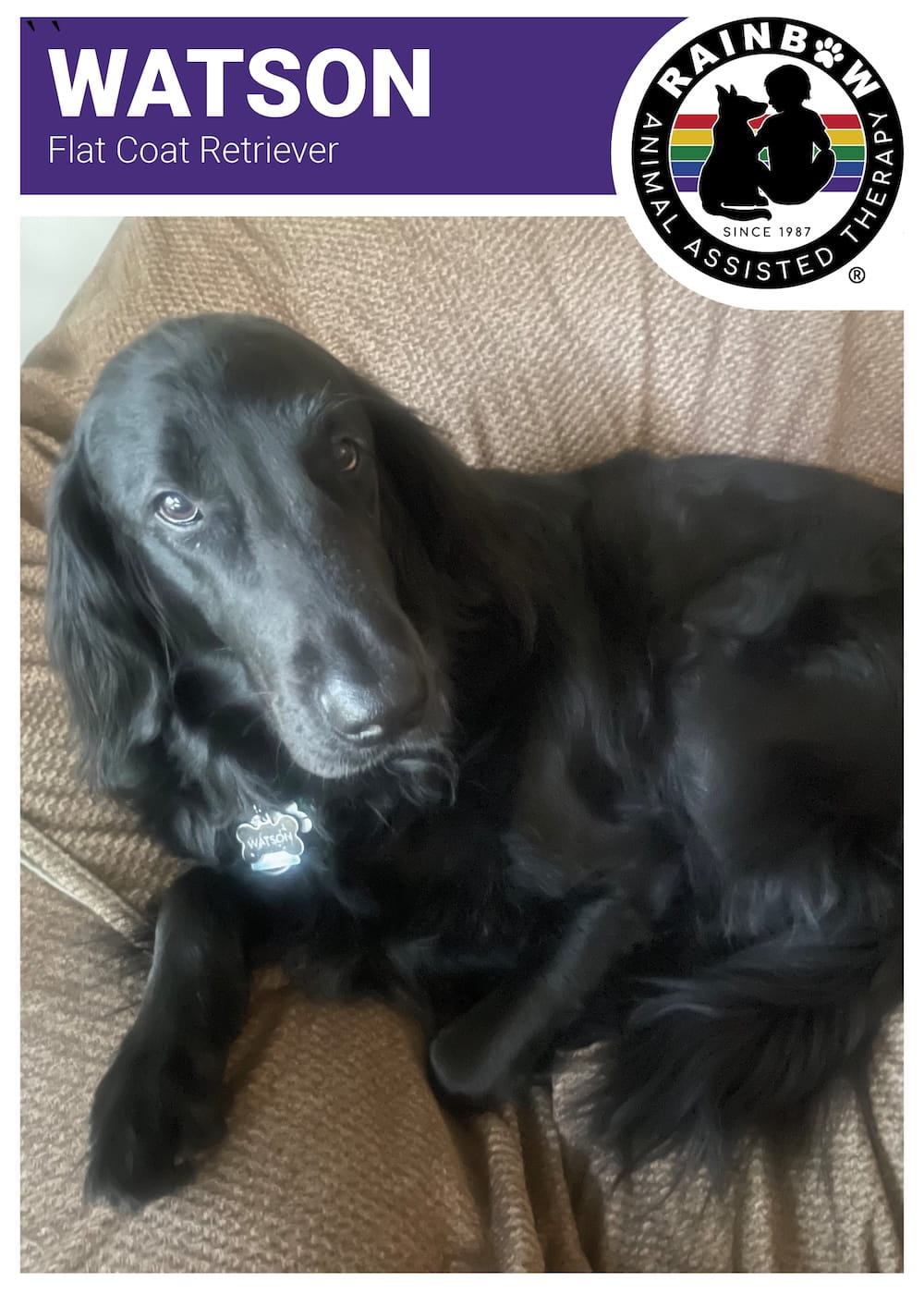 Meet Watson Certified Rainbow Animal Assisted Therapy Dog since 2022 Watson SPONSORED BY GLENBROOK HOSPITAL Community Advocate Sponsor since January 2025 Join Sponsorship Back to List Name: WatsonBreed: Flat Coat RetrieverBirthdate: February 23, 2019Date Certified: May 1, 2022 Favorite Toy: Any stuffed blue gatorFavorite Activity: Walking and visiting Become a Volunteer APPLY NOW Sponsor a Rainbow Dog MEET OUR DOGS Request a Program GET STARTED Make a Difference DONATE NOW